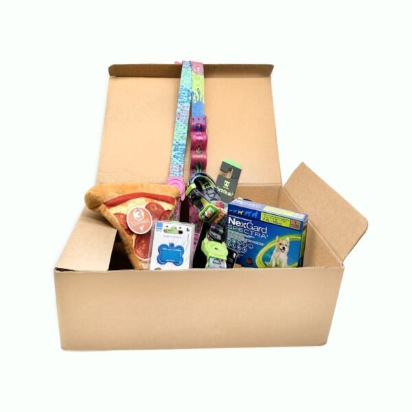 En cada caja podrás encontrar productos en la talla que elegiste para tu mascota.(Por ejemplo: Si escoges caja S Macho, encontrarás productos talla S y serán de colores masculinos)